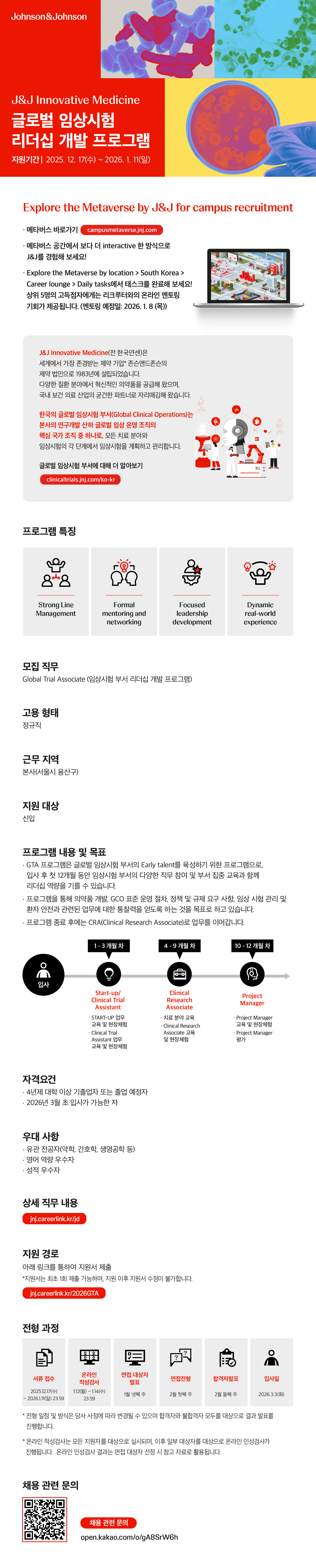 안녕하세요😀 Johnson&Johnson 채용 홍보 담당자입니다. 이번에 Johnson&Johnson에서 글로벌 임상시험 리더십 개발 프로그램을 진행합니다. 접수기간은 2025.12.17(수) ~ 2026.01.11(일)까지 진행되오니 귀교/귀학과 학생들이 많이 지원할 수 있도록 아래와 같이 홍보 협조 요청드립니다. *채용 전형별 접수기간이 상이합니다. 귀교의 우수한 인재들이 많이 참가할 수 있도록 최대한의 협조를 부탁드리겠습니다.